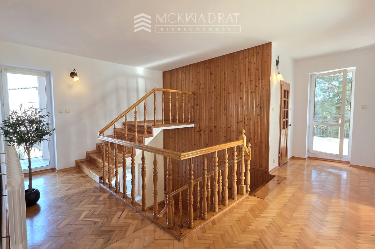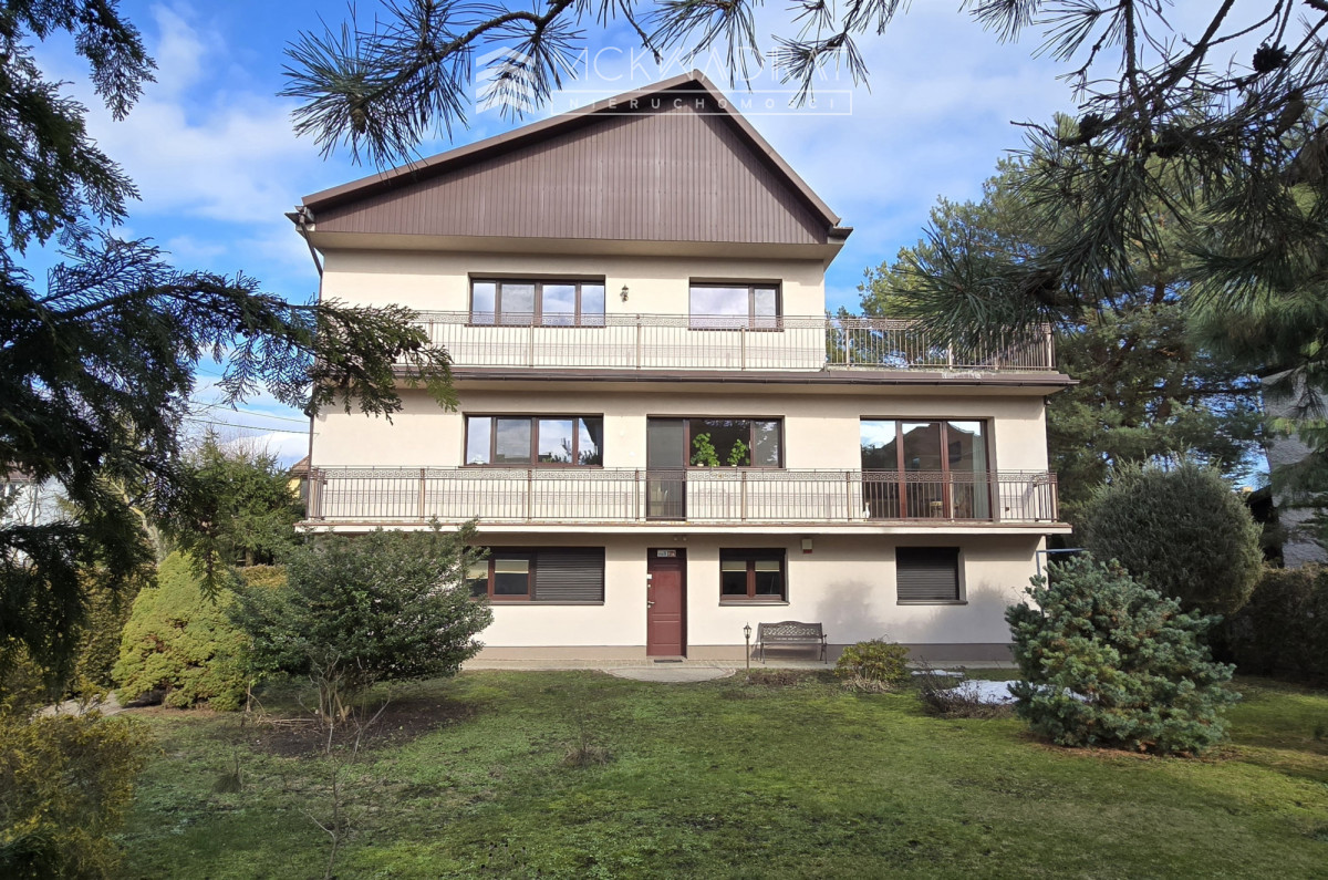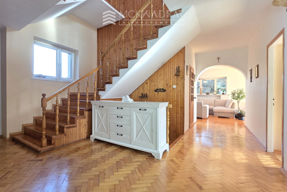 Reprezentacyjny i bardzo klimatyczny dom (6 pokoi) o powierzchni użytkowej 270 m2 plus garaż, położony na osiedlu Bacieczki, na dużej i ładnie zaaranżowanej działce o powierzchni 800 m2, w otoczeniu zieleni. Podjazd wykonany z kostki brukowej z miejscem na 4 samochody.