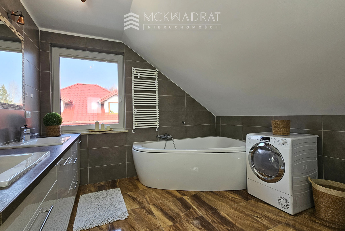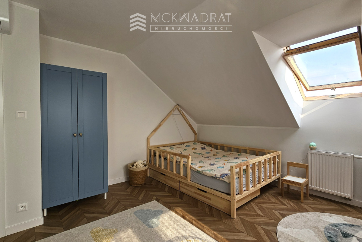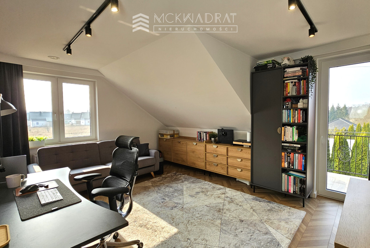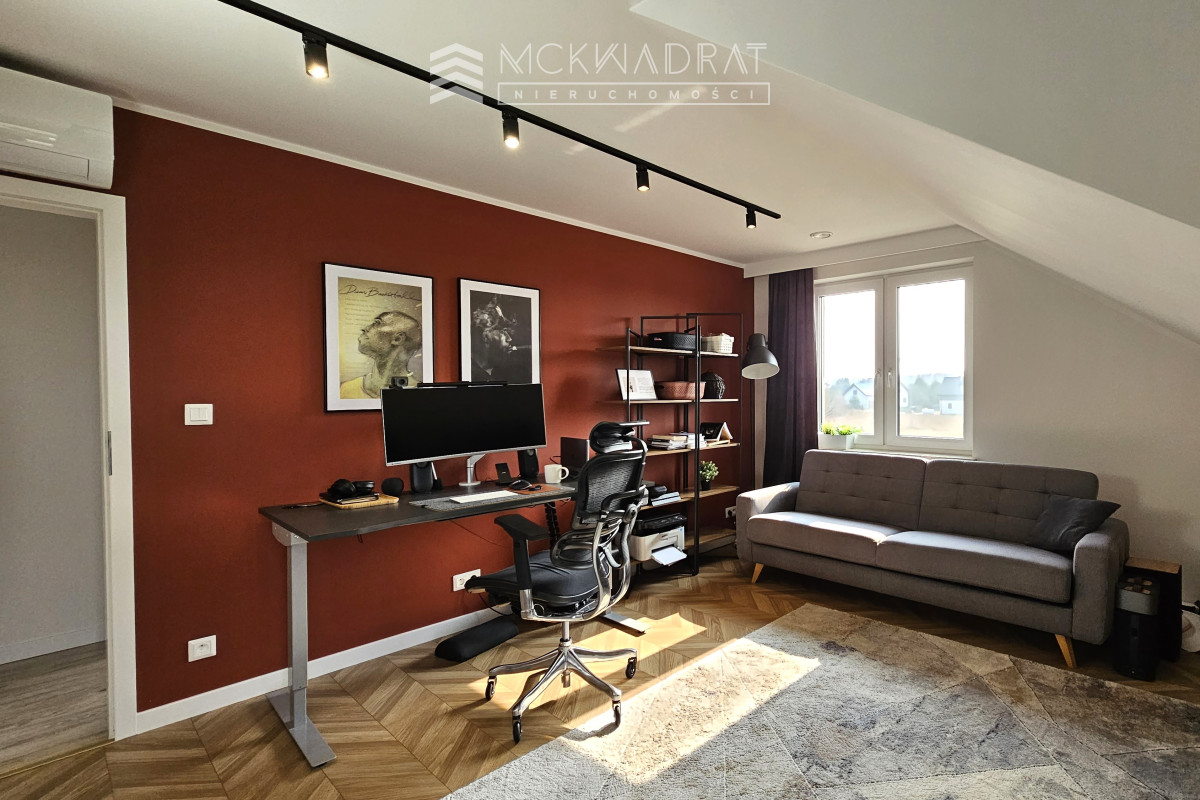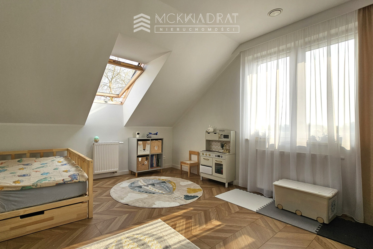 Na piętrze znajdziemy sypialnię główną z dużą garderobą, sypialnię dziecięcą, gabinet do pracy oraz wygodny pokój kąpielowy.