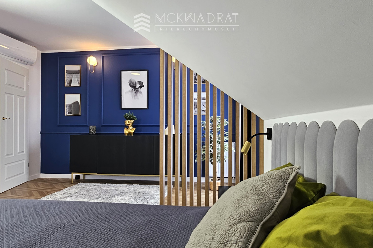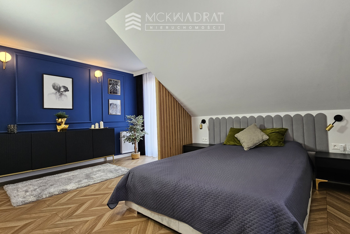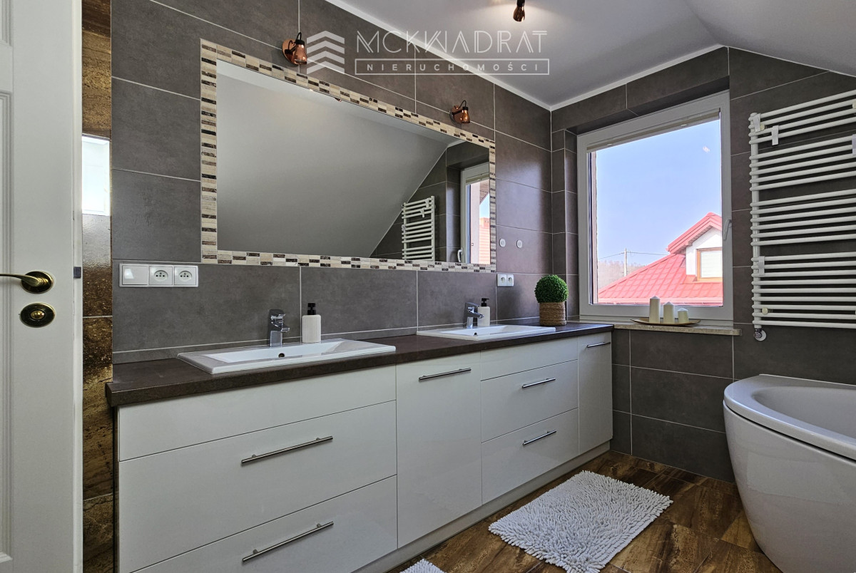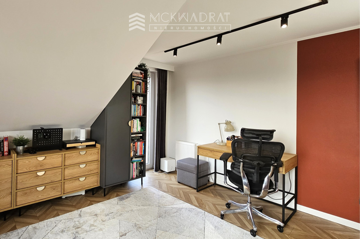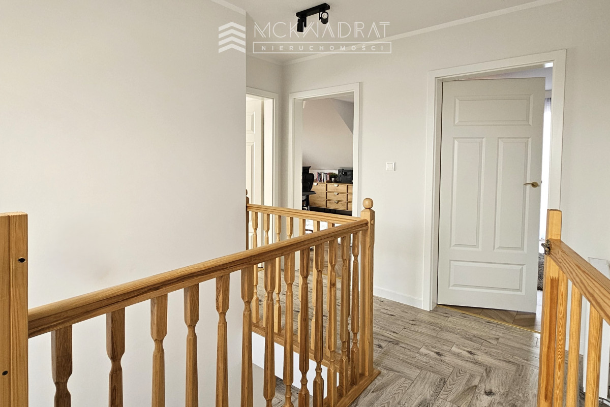 Na piętrze znajdziemy sypialnię główną z dużą garderobą, sypialnię dziecięcą, gabinet do pracy oraz wygodny pokój kąpielowy.