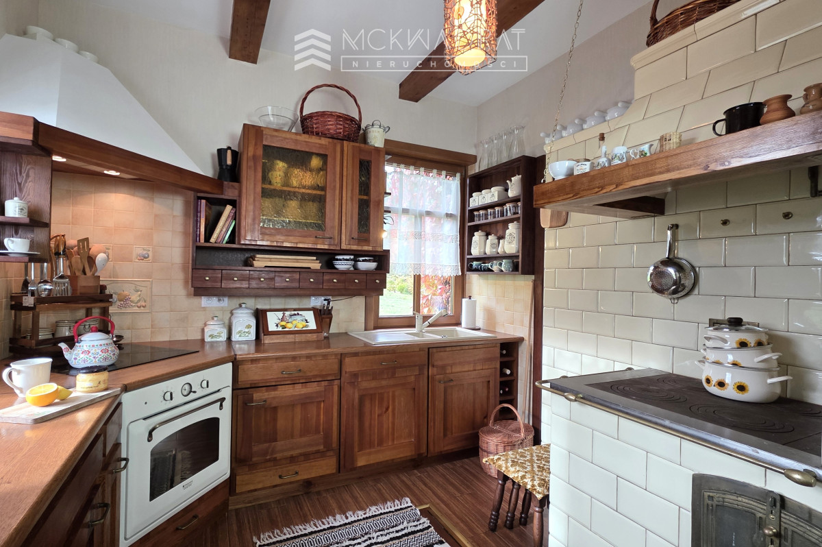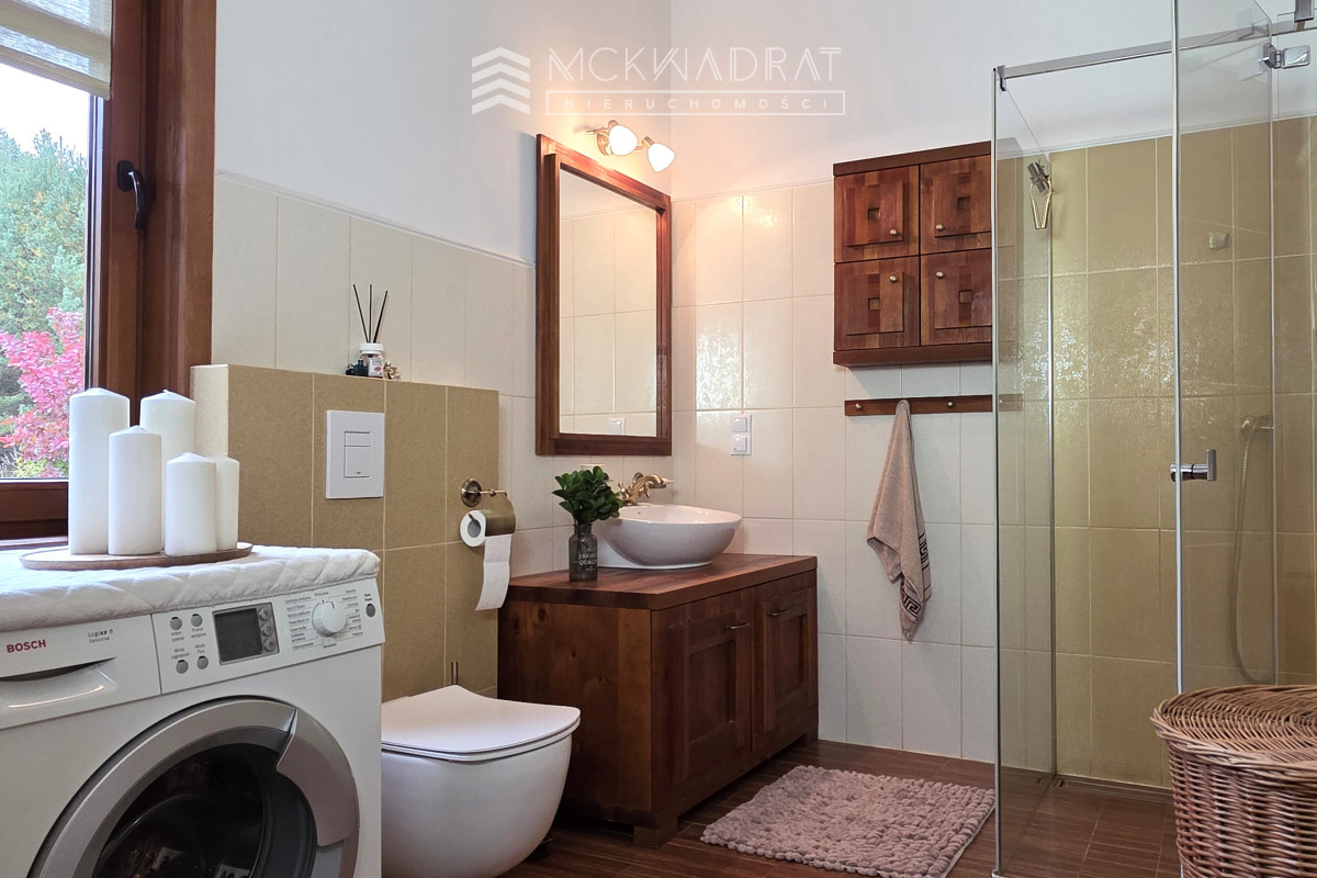 Na parterze usytuowana jest duża jadalnia ogrzewana kaflowym piecem, połączona z w pełni wyposażoną w AGD kuchnią (także zmywarka) - razem 32 m2 (ogrzewanie podłogowe), duża łazienka 7 m2 (grzejnik elektryczny) oraz sypialnia ogrzewana piecem kaflowym - 12,5 m2, ciągi komunikacyjne to 14 m2.