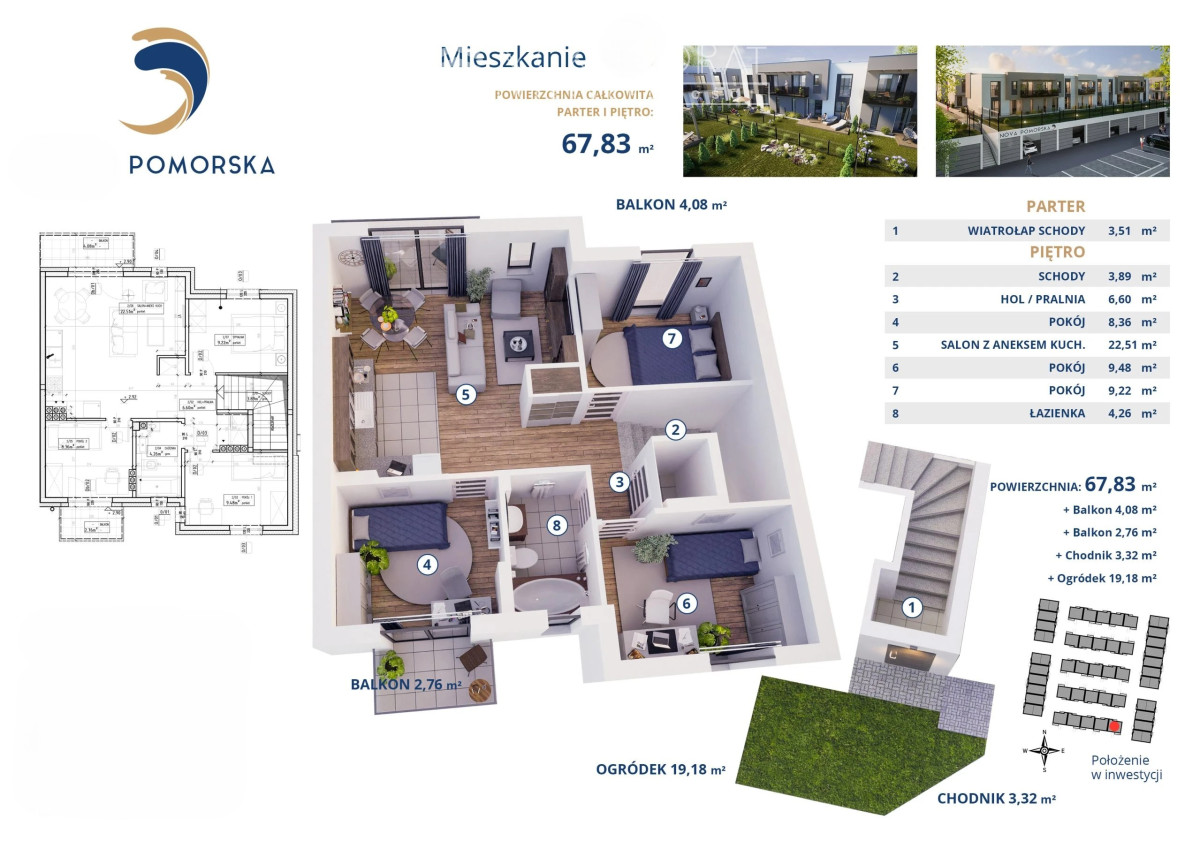 Kameralne osiedle domów w zabudowie szeregowej, zbudowane w końcu 2025 roku, nowoczesna architektura budynków i estetyczna kolorystyka, zlokalizowane przy ulicy Pomorskiej, na skraju osiedli Skorupy, Piasta i Mickiewicza - bardzo blisko centrum Białegostoku.