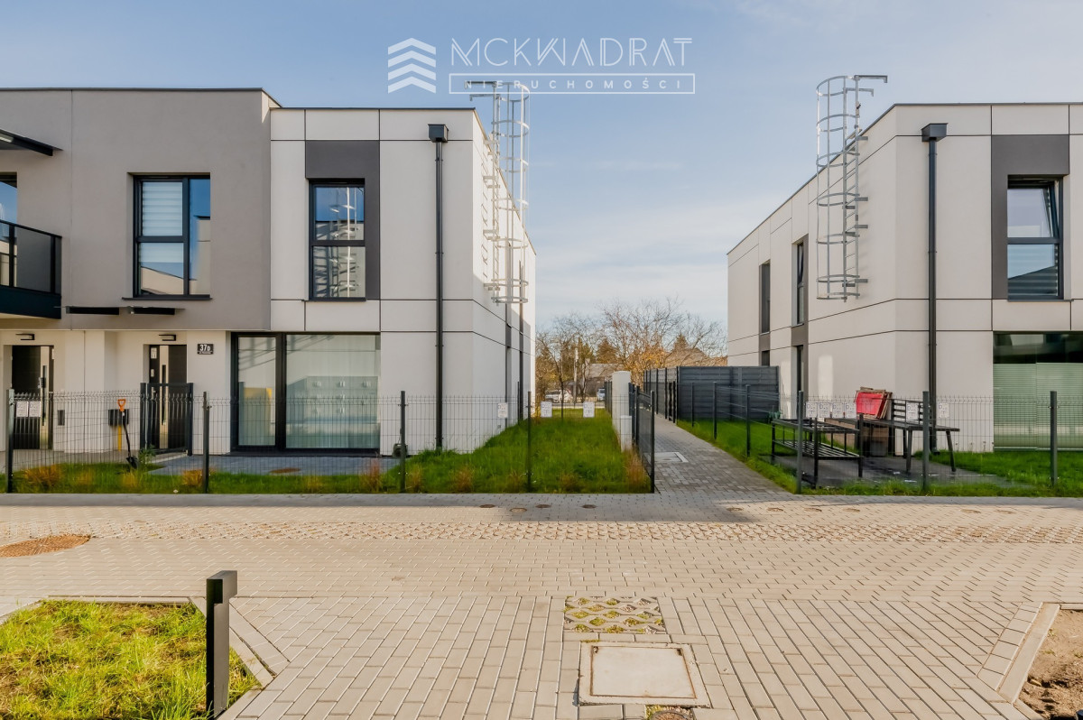 Pomiędzy budynkami wykonano piesze ciągi komunikacyjne, co ogranicza ruch samochodowy w strefie mieszkalnej i sprzyja ciszy oraz komfortowi codziennego życia. Cały teren osiedla wyposażony jest w zewnętrzne oświetlenie, umożliwiające bezpieczne poruszanie się po zmroku. Uzupełnieniem całości są solidne drzwi zewnętrzne oraz nowoczesne profile okienne w grafitowym kolorze, które nadają inwestycji spójny i nowoczesny charakter.