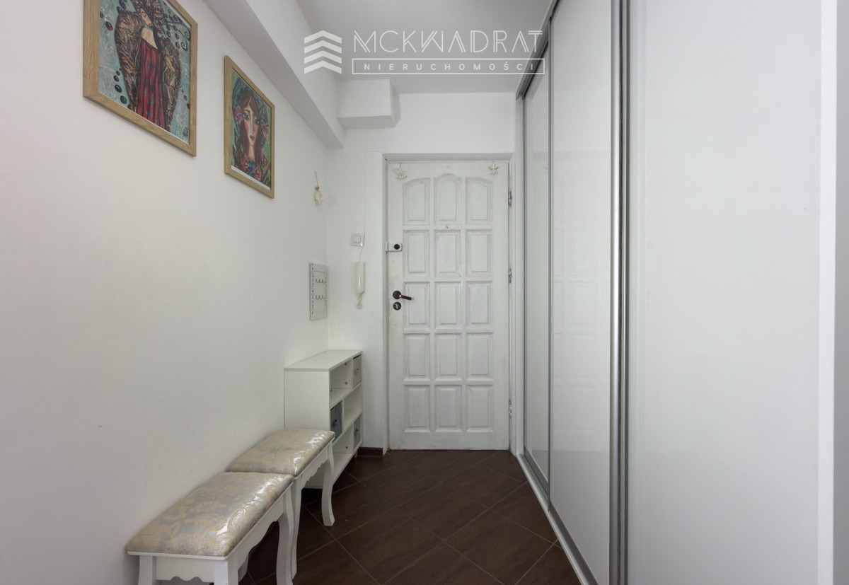 Mieszkanie ma 47 m² i składa się z przestronnego salonu, dwóch niezależnych sypialni, oddzielnej kuchni oraz łazienki wyposażonej w pralkę i suszarkę. Z salonu prowadzi wyjście na balkon. Do lokalu przynależy również piwnica.
