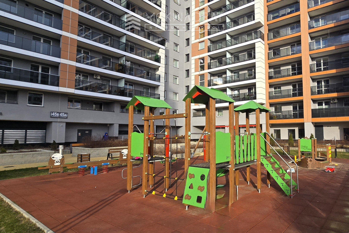Wiele bezpłatnych miejsc parkingowych wokół budynku, plac zabaw dla dzieci.