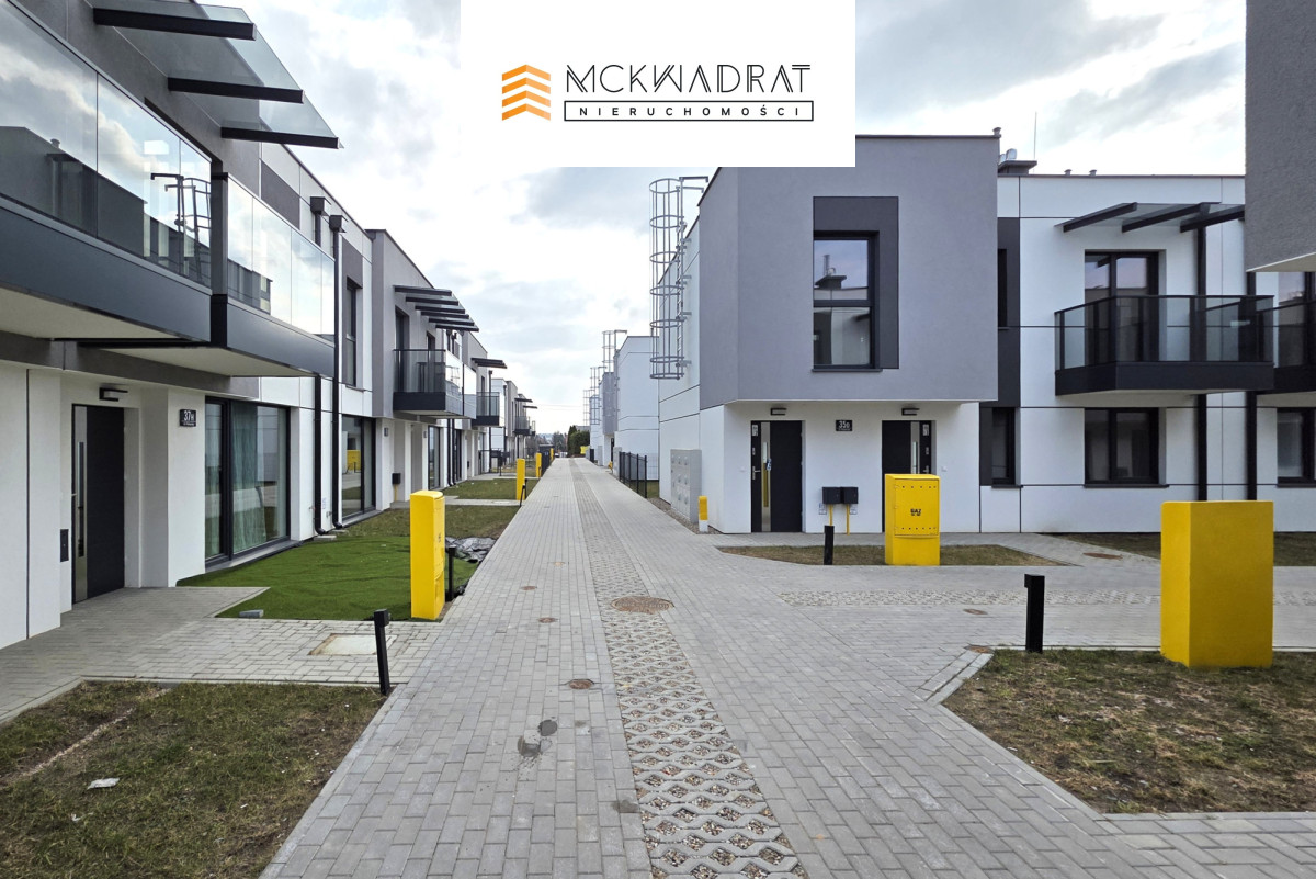 Pomiędzy budynkami wykonano piesze ciągi komunikacyjne, co ogranicza ruch samochodowy w strefie mieszkalnej i sprzyja ciszy oraz komfortowi codziennego życia. Cały teren osiedla wyposażony jest w zewnętrzne oświetlenie, umożliwiające bezpieczne poruszanie się po zmroku. Uzupełnieniem całości są solidne drzwi zewnętrzne oraz nowoczesne profile okienne w grafitowym kolorze, które nadają inwestycji spójny i nowoczesny charakter.