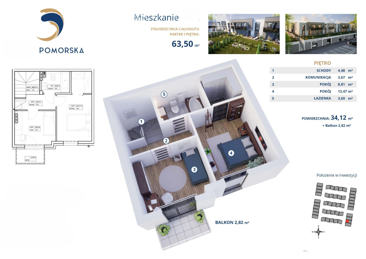 Mieszkanie o powierzchni 63.50 m2, dwupoziomowe usytuowane jest na parterze i piętrze.