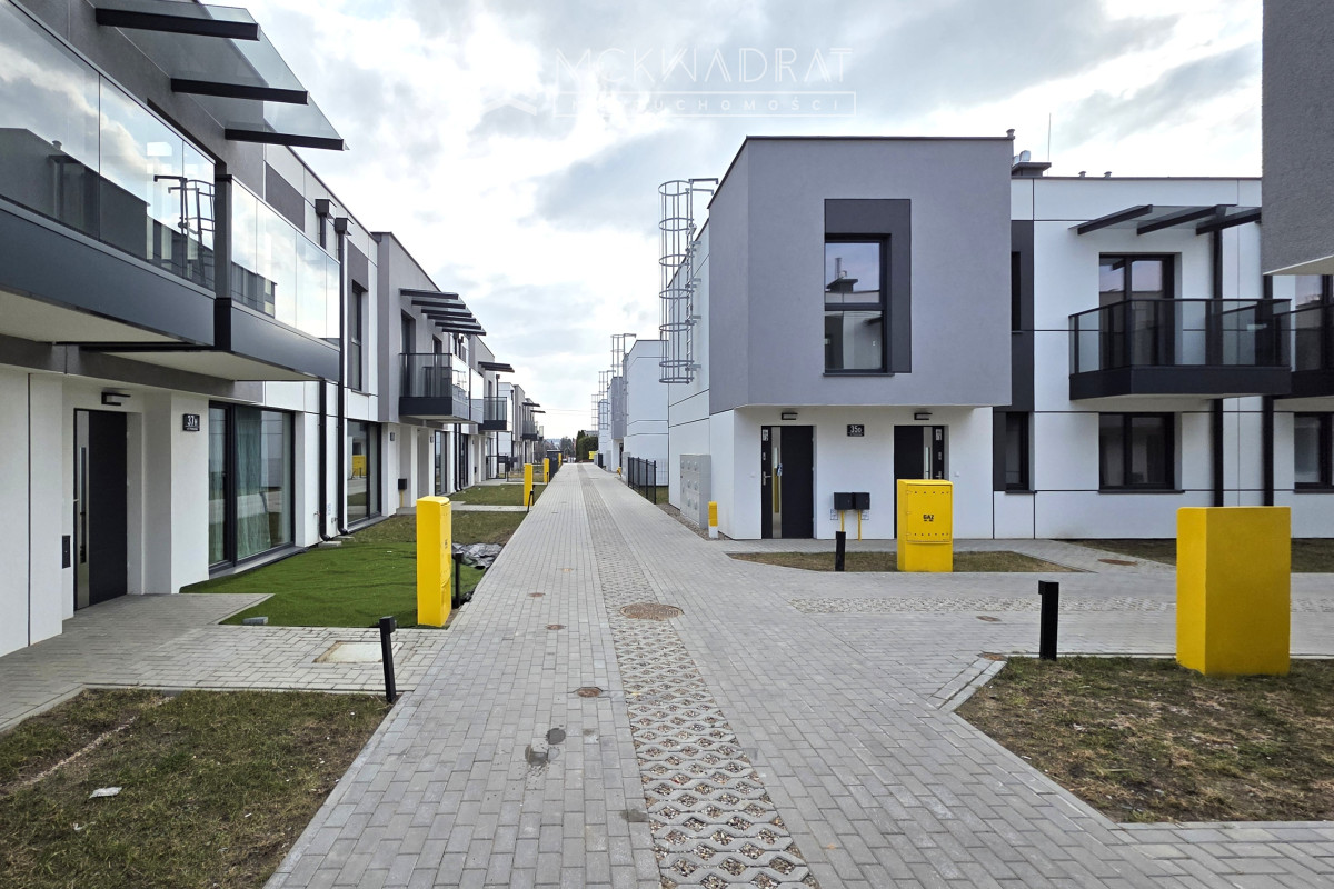 Pomiędzy budynkami wykonano piesze ciągi komunikacyjne, co ogranicza ruch samochodowy w strefie mieszkalnej i sprzyja ciszy oraz komfortowi codziennego życia. Cały teren osiedla wyposażony jest w zewnętrzne oświetlenie, umożliwiające bezpieczne poruszanie się po zmroku. Uzupełnieniem całości są solidne drzwi zewnętrzne oraz nowoczesne profile okienne w grafitowym kolorze, które nadają inwestycji spójny i nowoczesny charakter.