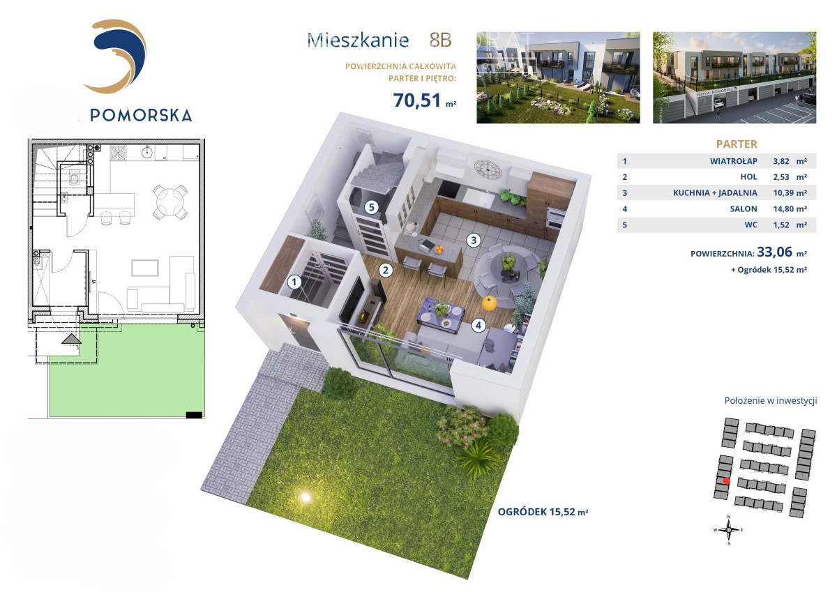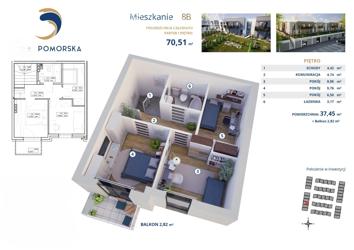 Mieszkanie o powierzchni 73.82 m2, dwupoziomowe, usytuowane jest na parterze i piętrze.